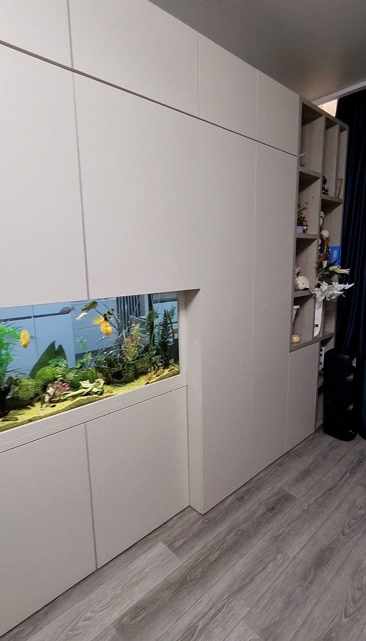 😍 Стенка в гостиную с интегрированным аквариумом и зоной TV. Материал – ламинат Egger, фурнитура BLUM.👍